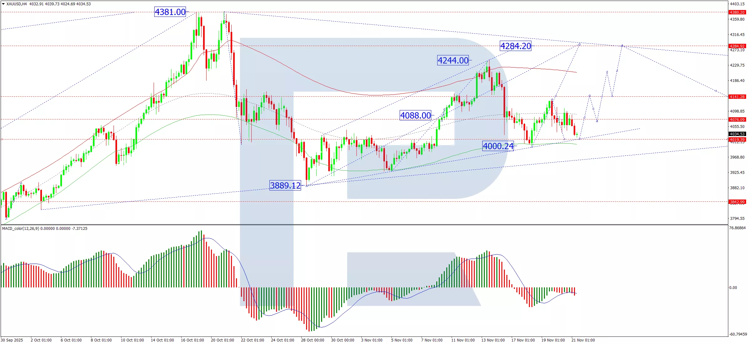 On the H4 chart, XAU/USD is forming a consolidation range around 4,076 USD. The pair may first extend this range downward toward 4,019 USD before resuming an upward move to 4,141 USD. A decisive break above this level would open the path for a fifth wave of growth targeting 4,285 USD. The MACD indicator supports this view, with its signal line below zero, suggesting the current correction has further to run before the next leg higher.