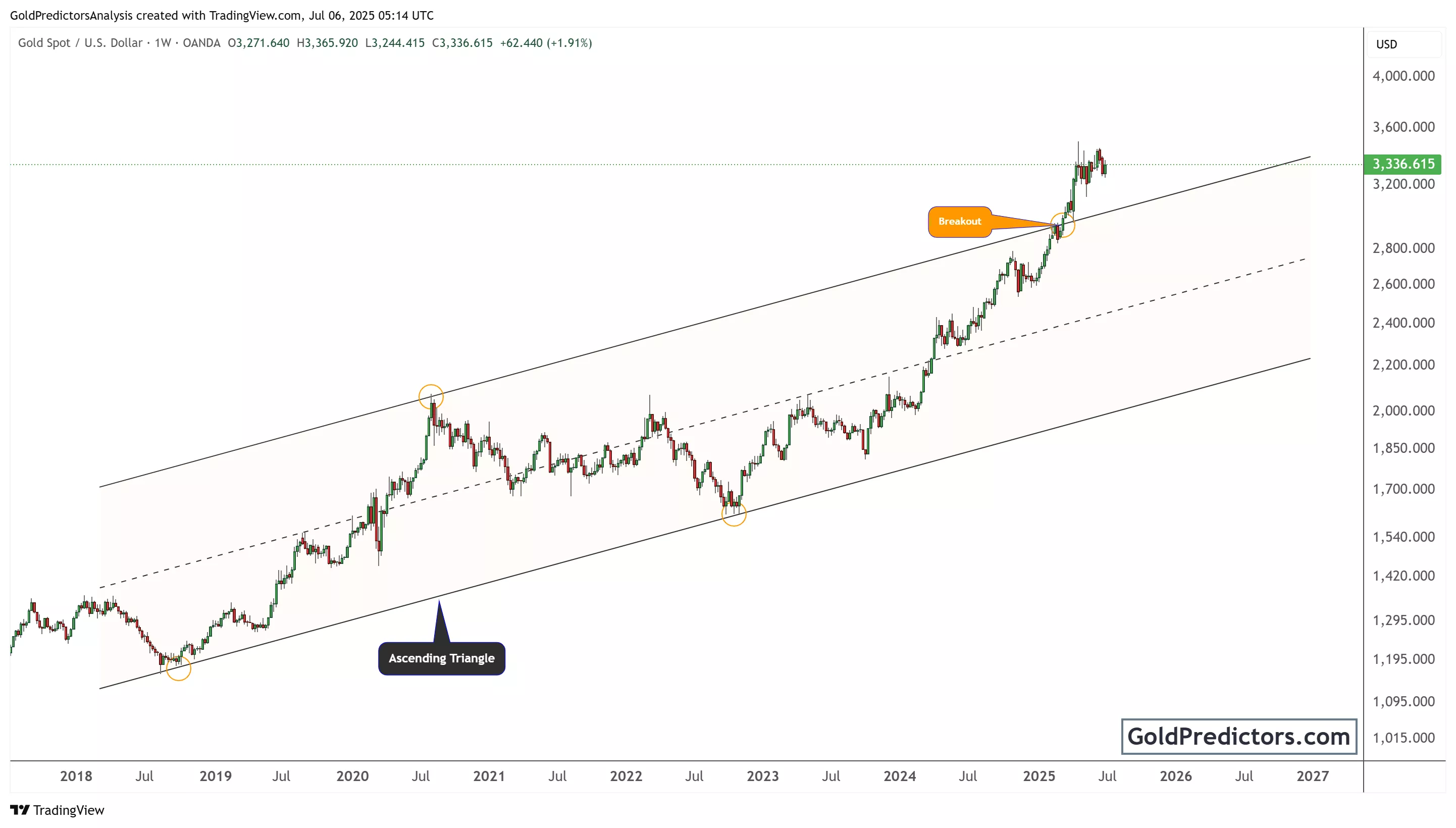 In early 2023, gold touched the lower boundary near $1,800 and began another leg higher. It followed a series of higher lows and higher highs—hallmarks of a bullish structure. The breakout highlighted on the chart occurred above the mid-channel resistance line around late 2024. This breakout signalled the beginning of a stronger, accelerated uptrend.