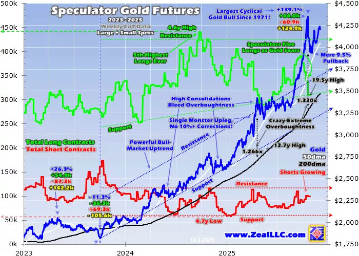 Almost as unbelievably as specs’ gold-futures trading into mid-October, gold’s epic record 139.1% bull hasn’t suffered a single 10%+ correction!The worst selloff was that 9.5% into early November 2025, and before that another large 8.0% pullback into mid-November 2024. Rather than correcting like usual, this mighty gold bull has amazingly enjoyed three previous high consolidations which are highlighted in this chart.