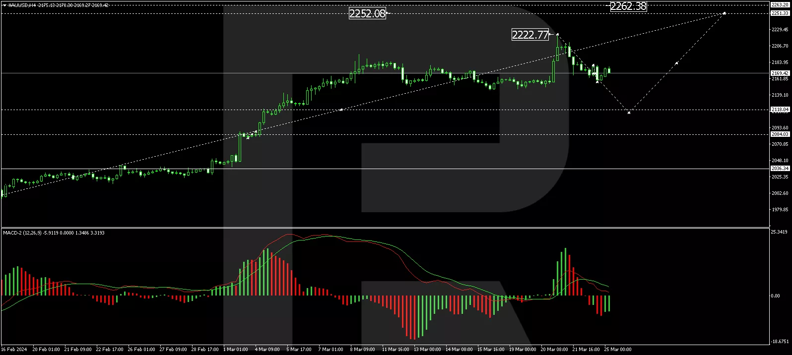 On the H4 chart, XAU/USD reached a local target of 2222.77. A correction to the level of 2157.05 has been executed today. Currently, the market is forming a consolidation range around 2168.40. A downward breakout is expected, followed by a continuation of the correction to 2114.60. After completing this correction, a growth wave to 2251.33 is anticipated. This scenario is supported by the MACD indicator, with its signal line above zero and sharply directed downwards.