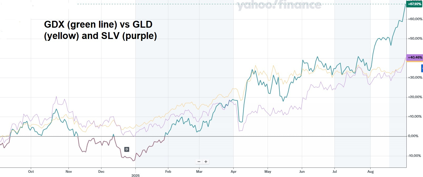 These stocks are already outperforming the underlying metals. In the following chart, GDX is an ETF that holds the big gold miners, while GLD and SLV track gold and silver prices, respectively.