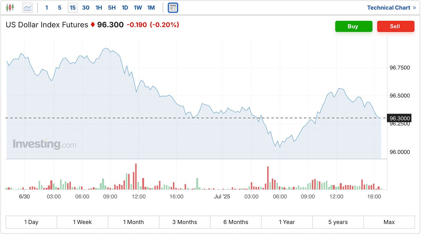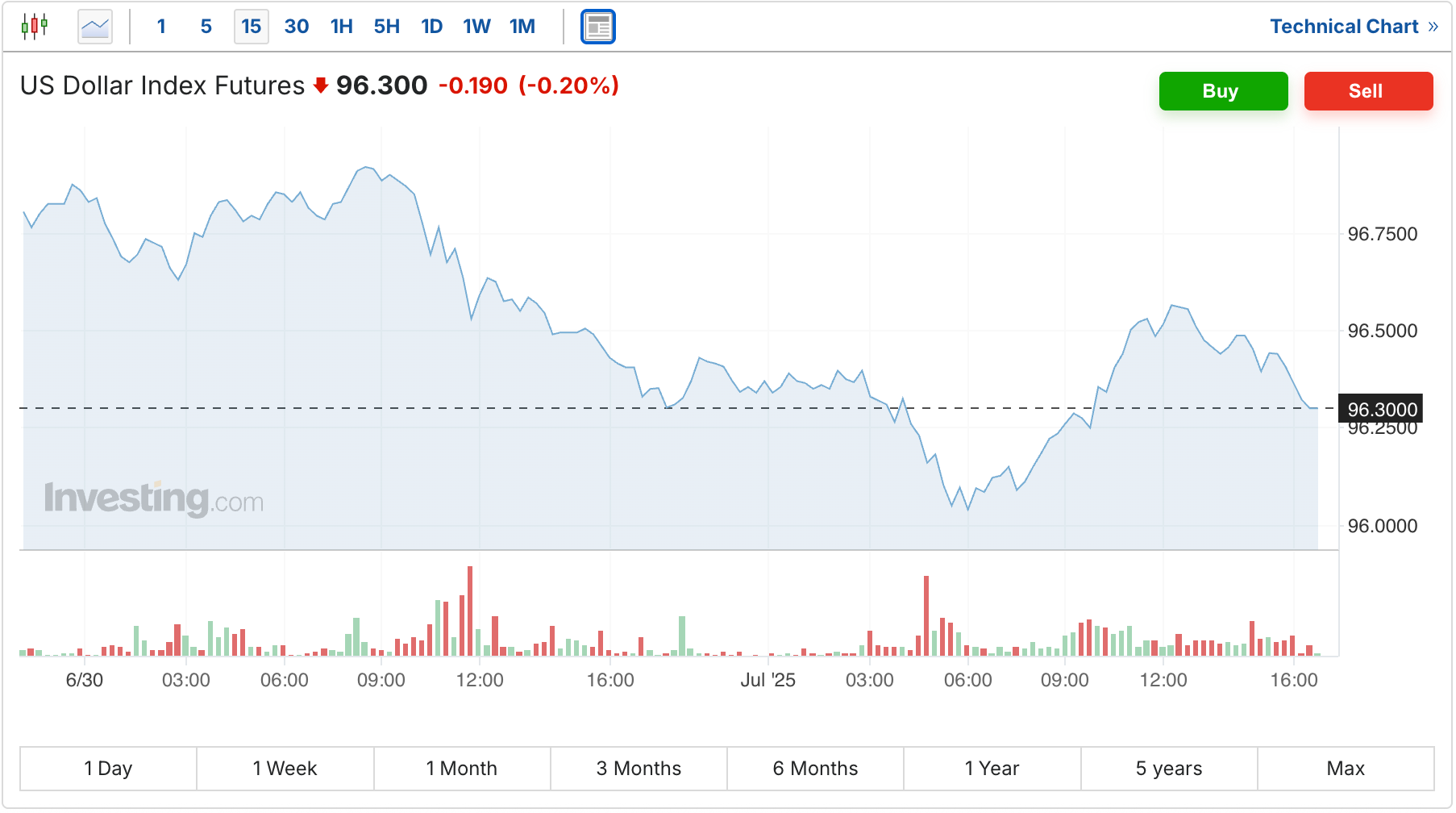 The dollar index continued its now stunning descent, falling another 19 basis points down to 96.30.
