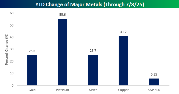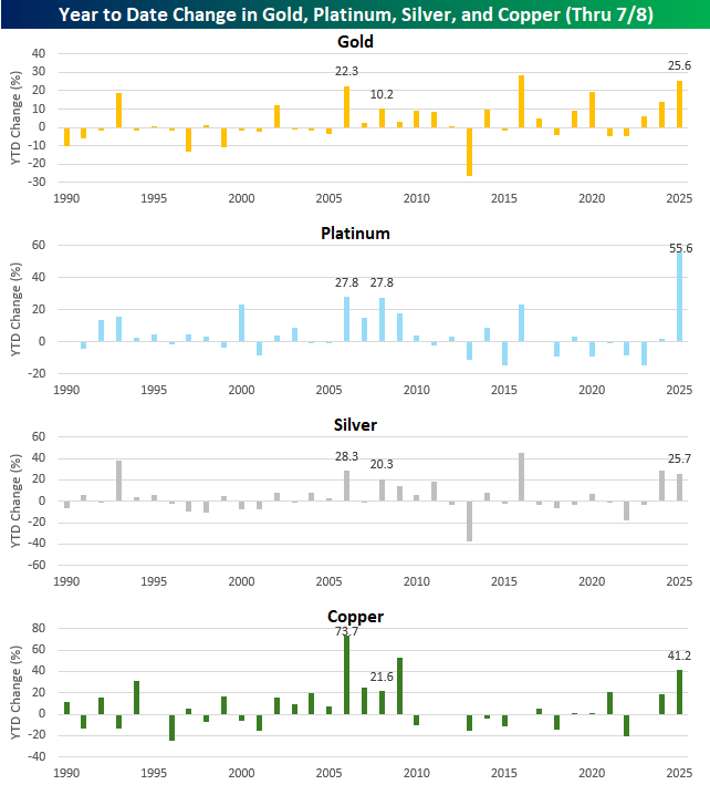 While all four commodities have experienced other YTD gains of 25%+, this year is the first time all four have rallied 25%+ YTD through 7/8 in the same year. The only time they ever all simultaneously rallied 20%+ YTD was in 2006, and the only other year when all four were even up 10% YTD at this point in the year was in 2008. Other years since 1990 have seen big runs in the metals, but none of them have been quite like the 25%+ across the board gains in 2025.