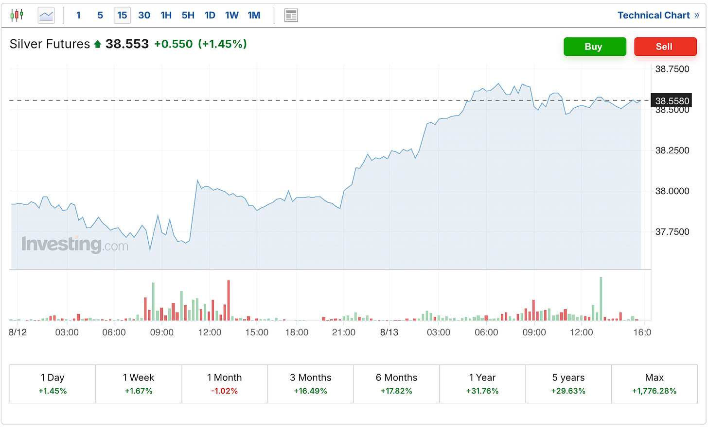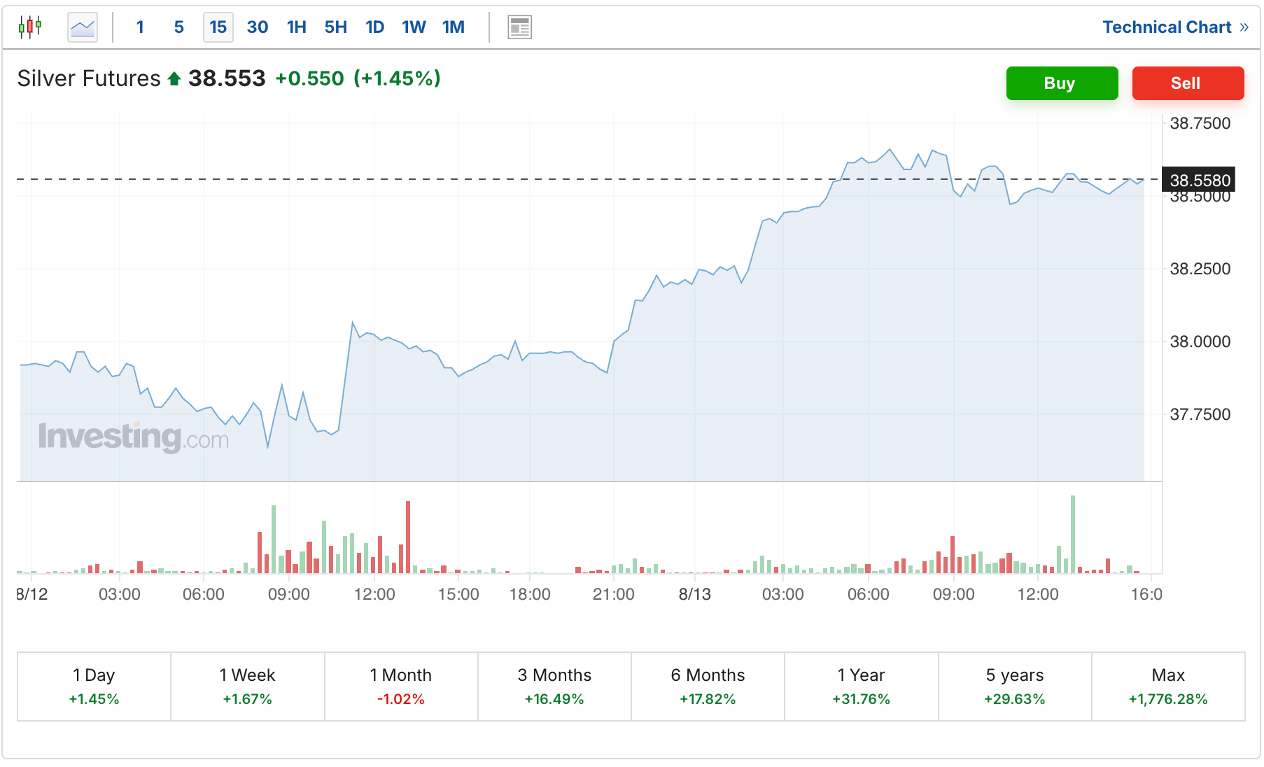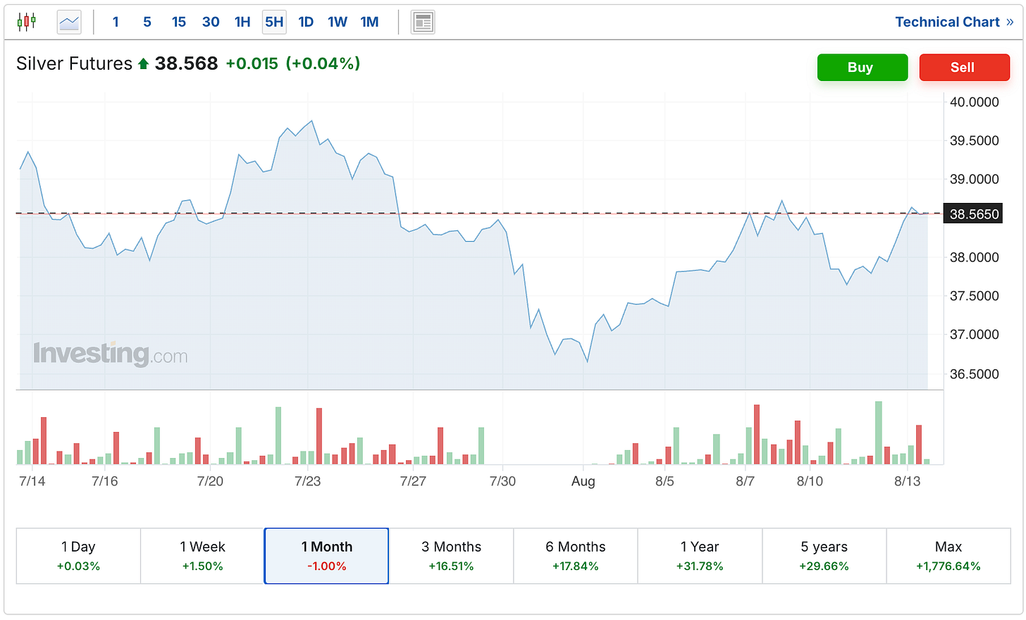 When you take a step back and see silver back up at $38.55, in some ways, it’s rather incredible, especially given how just less than two weeks ago, the price had sold off down to $36.62 on August 1. And here you can see in the 1-month chart just how volatile the silver price has been over the past few weeks.