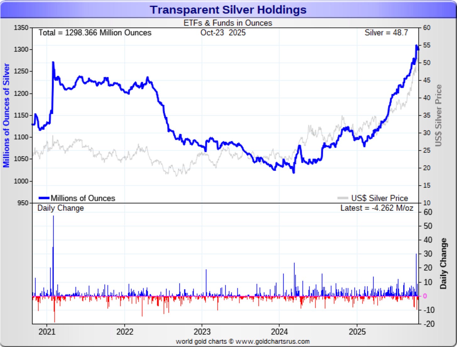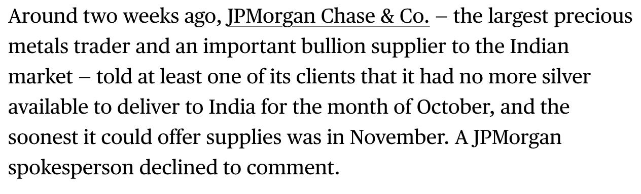 Of course the key place to look right now, perhaps aside from the LBMA, is in India, where back on October 9th, aka ‘the day that the silver market broke’ (not just according to me, but to Bloomberg, and a handful of traders and market participants as well), when it was first reported that Indian ETFs had to halt new additions because of a silver shortage in India.