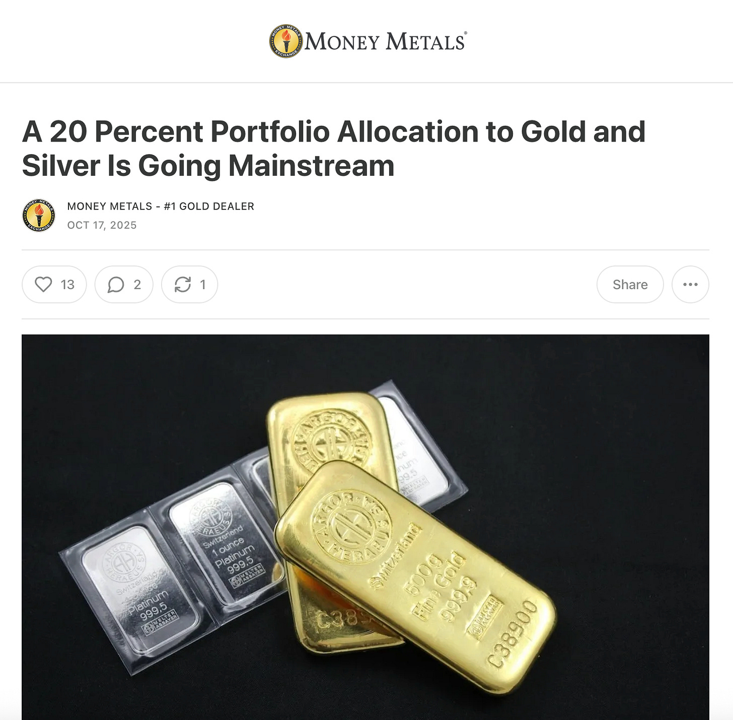We’re hearing more about the 60/20/20 portfolio, which is an update to the traditional 60/40 stock/bond portfolio, but the 60/20/20 is now advocating a 20% allocation to precious metals.