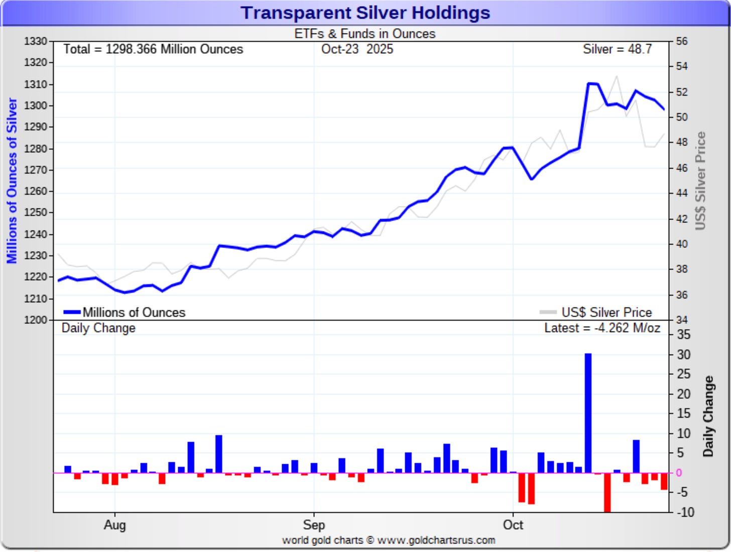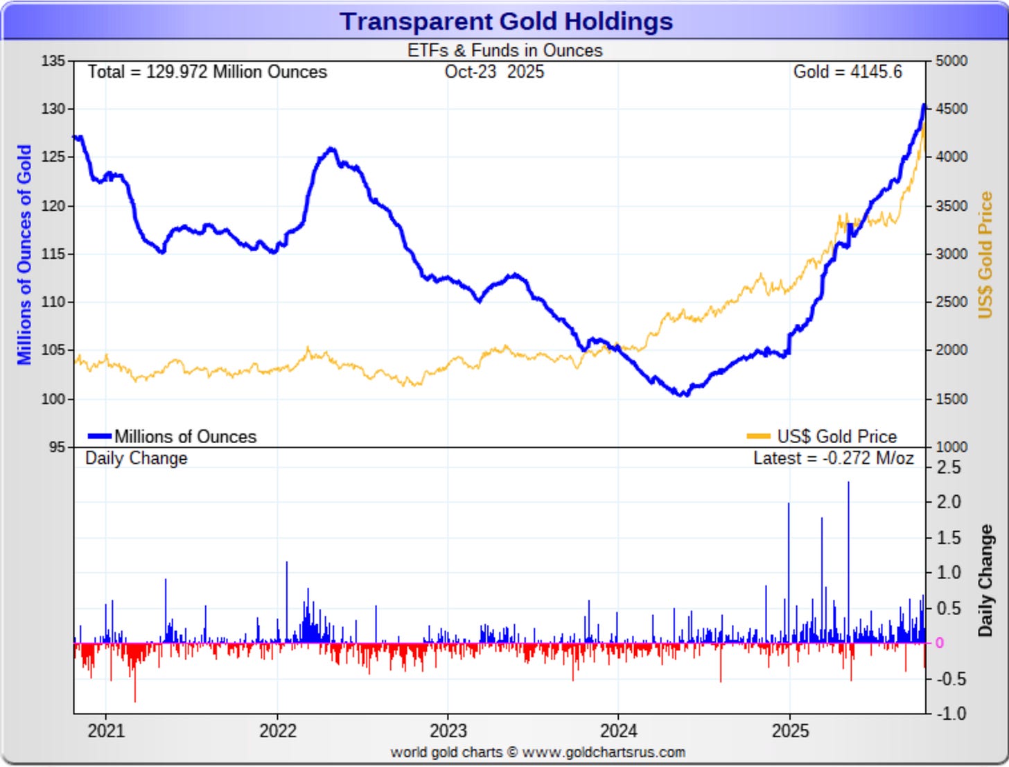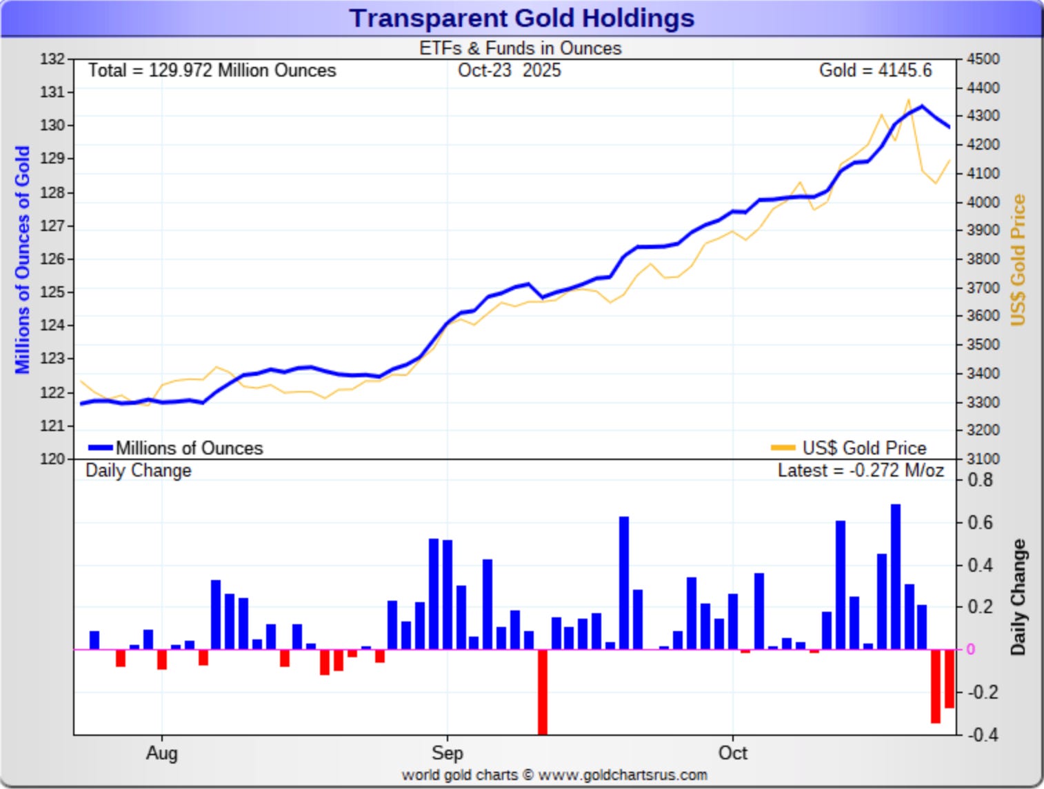In the next chart, you can see the daily gold ETF additions/subtractions, and how metal has continued getting added to the trust, even throughout the sell-off, until large withdrawals on October 22nd and 23rd.