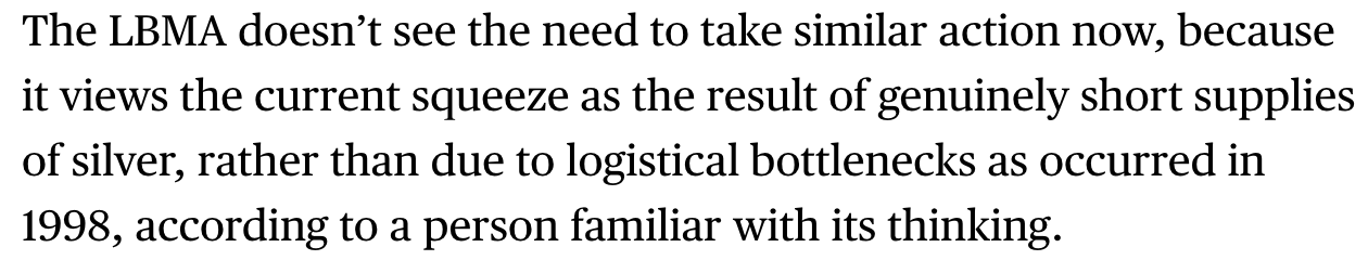 Bloomberg also added the following note about the LBMA, which if accurate, suggests that even they think this isn’t just a geographic dislocation, but a case of ‘genuinely short supplies of silver.’