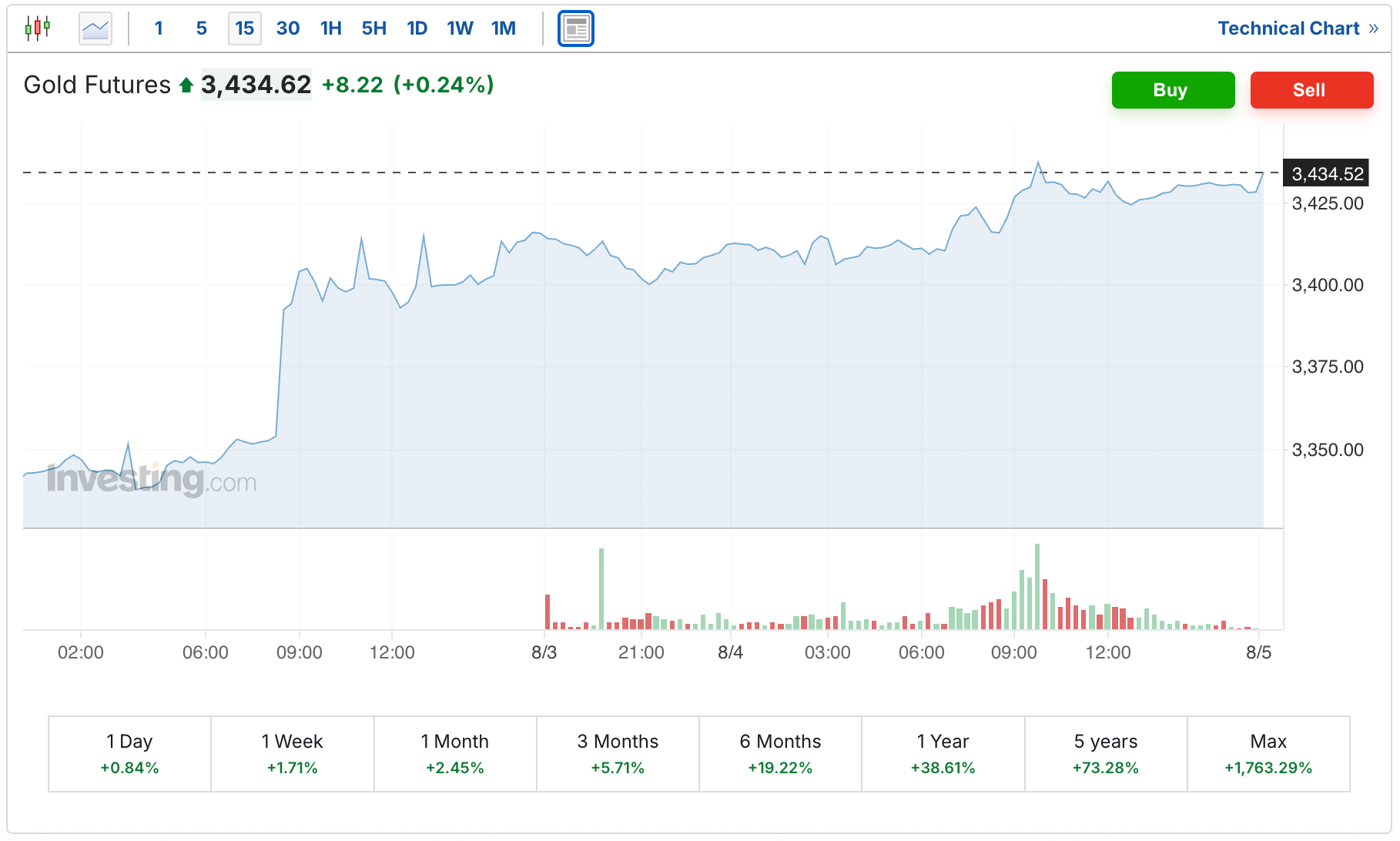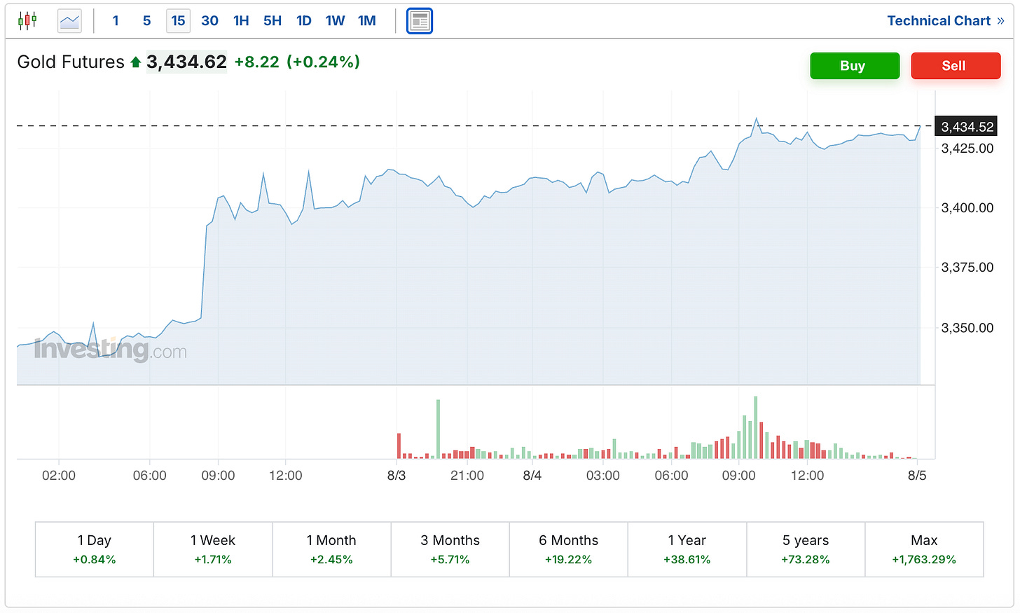The Gold futures were up $8 to $3,434.