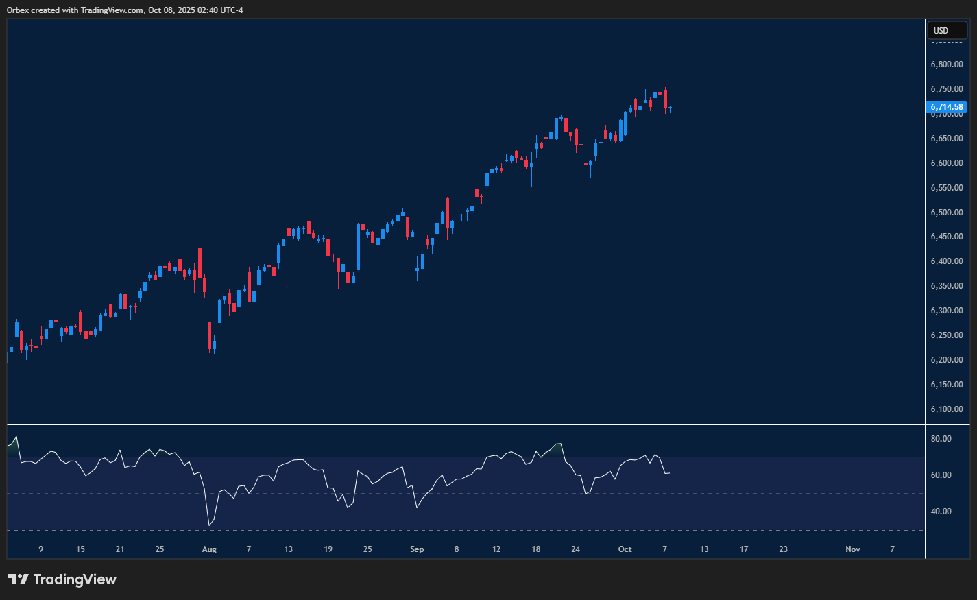 The S&P climbs to another peak as stocks maintain their progression. A surge above 6730 forced sellers to cover, until the pullback saw price action trade just above the 6710 level. In the meantime, the RSI’s venture into the overbought area could lead to a temporary retracement, which the bulls may view as an opportunity to stake a claim, as sentiment could shift. 6600 would be the closest support at the previous dip in the market.