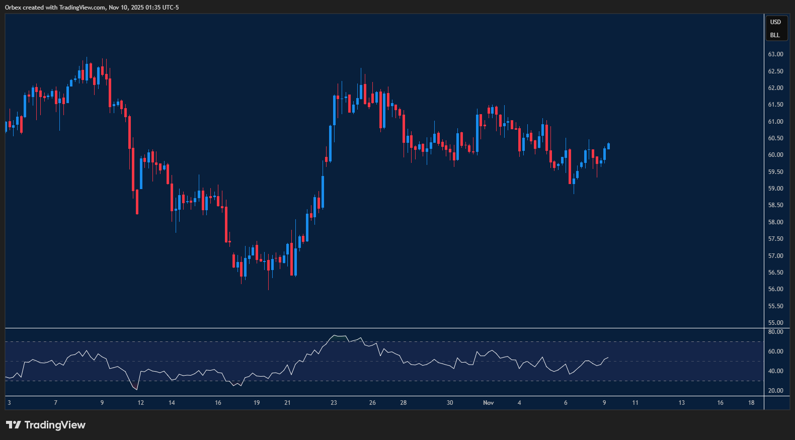 The WTI oil remains in a bearish channel as price action fails to test the previous high. The price is expected to stay above 60.00, as a fall below the previous low of 58.80 will expose further weakness, as short-term buyers will likely close more positions. An acceleration above 60.50 could prompt buyers to attract more buyers to close above 62.00. As the RSI remains undecided, 60.80 is the first resistance to clear, in the hope of filling the weekend gap.