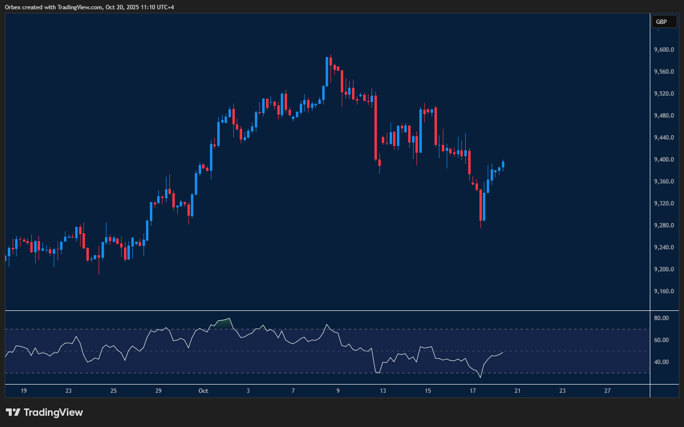 The FTSE continues grinding higher after firmly moving away from the 9300 area. On the chart, the price remains bullish with the 100-point jump, as bulls prepare themselves for a possible test at the latest peak of 9500. A rise above this specified zone would indicate an interest in putting the index back on track. On the flip side, stiff selling could be expected from profit-taking, with 9320 as the first support to prevent a deep reversal.