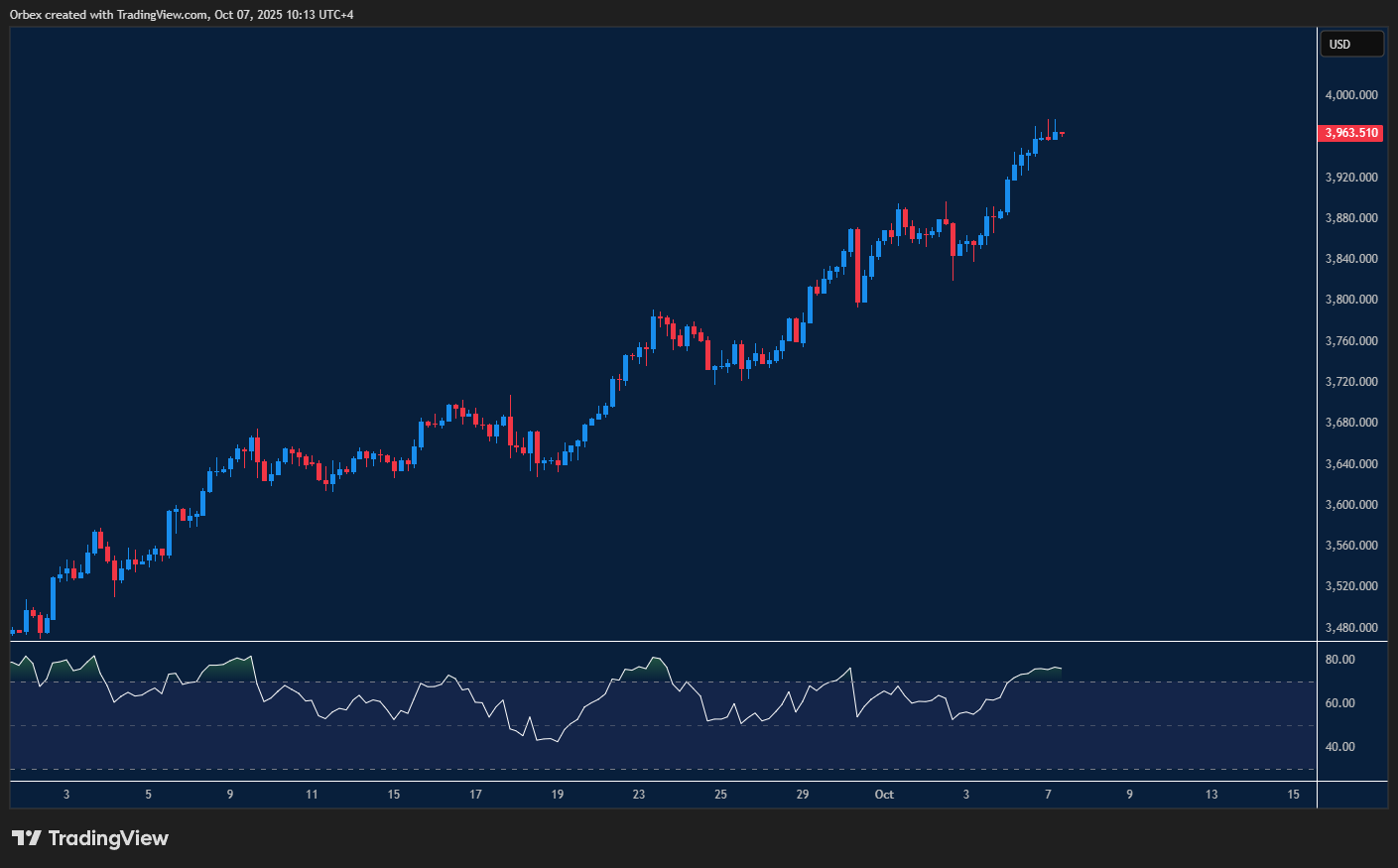 Gold pulls back slightly from hitting another record as bulls await the next round of the FOMC. A close above the former daily support of 3920 prompted some sellers to cover their positions, as the bullish run continues. A brief consolidation has found some support, and a higher high indicates mounting pressure. 3980 is the next threshold, and 3950 is the first support in case of a fallback, as the RSI becomes overbought again.