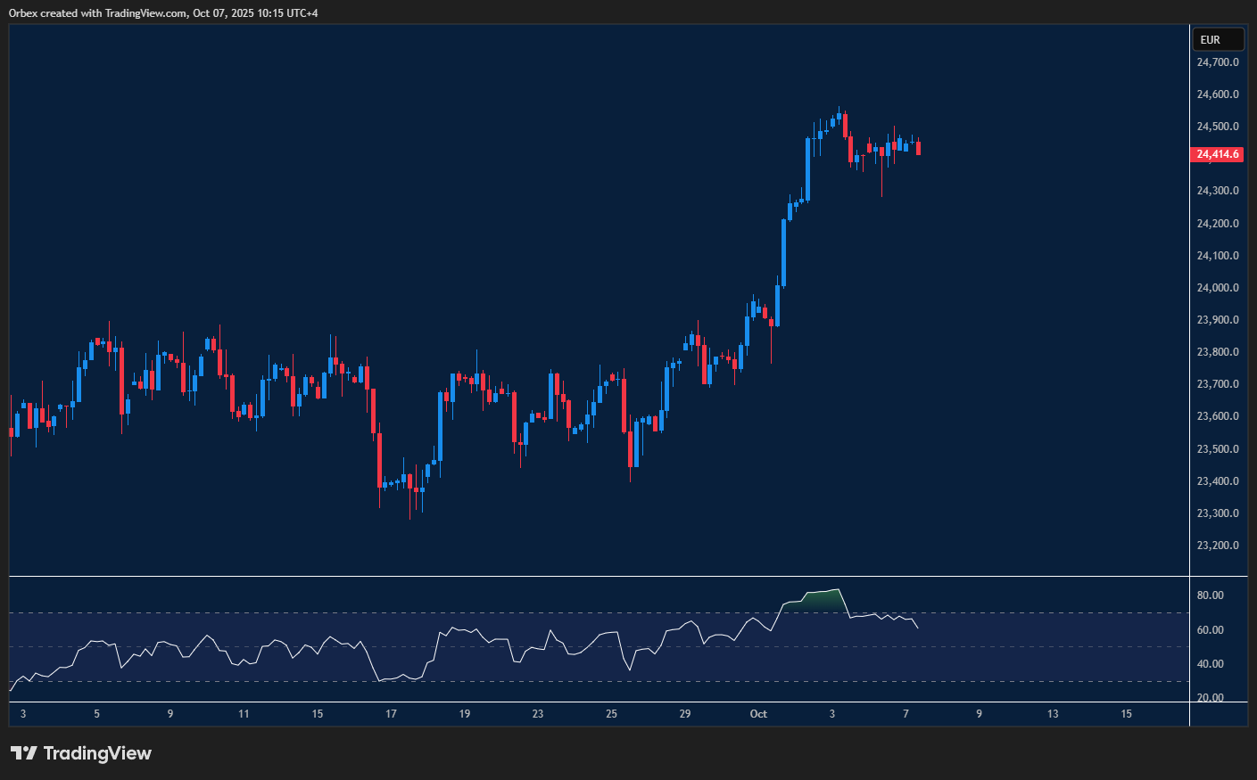 The index is looking for a test back towards the 24000 area, as European stocks digest the resignation of the latest French Prime Minister after 27 days in office. The latest move saw renewed buying pressure at 24400, suggesting that the index has stabilised on its corrective path. A close back above the previous spike of 24550 would help the bulls regain control and open the door to an extended rebound. On the downside, 24250 is a fresh support for the bulls to regroup.
