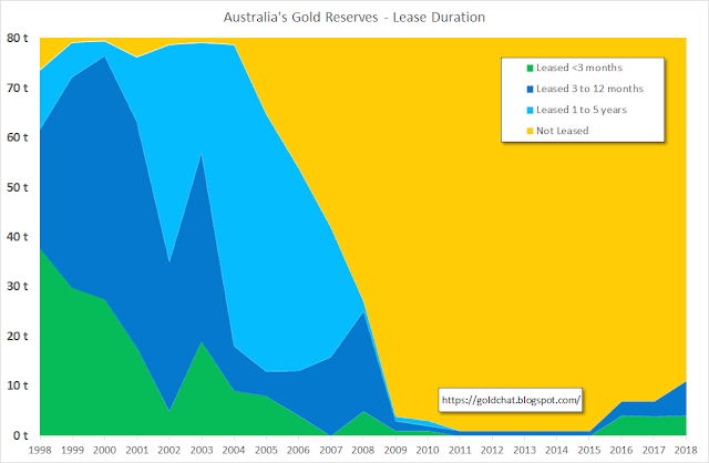 The RBA reported average balance was 4 tonnes in less than 3 months and 5.1 tonnes between 3 to 12 months. That works out about 5 months average duration, which is closest to the 6 month green line in Nick's chart. In that case, the 0.15% looks like a fair result from the RBA compared to market rates. Having said that, the 0.15%, in my opinion, is too low notwithstanding the RBA is lending on a collateralised basis or to entities with "government support". The red line on the first chart shows that the RBA was pretty much lending out all of Australia's gold reserves prior to 2005 but sharply pulled out of the market as its longer term (1-5yr duration) leases matured into a market where lease rates were sub 0.40%. It clearly didn't think the risk/return tradeoff was right at the time and that was prescient considering the GFC hit in 2008. If the RBA is willing to increase its gold leases at 0.15% it must now consider everything has been fixed and financial risks are low - a position many would think is questionable.