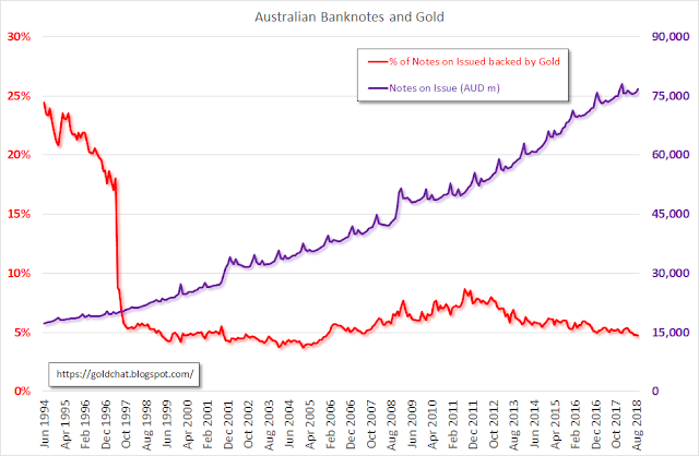 Isn't that a curious stability, averaging 5.55% within a range of 3.7% to 8.6% since the sale - is the RBA surreptitiously maintaining Australia on a 5.55% gold standard? One final observation: if we were to move to 100% gold backed banknotes it would require Australia to hold gold reserves of 1,457 tonnes. At Australia's current rate of gold mine production, it would only take five years to get there. Something to aim for, or is Australia better off to just keep shipping its gold off to China?