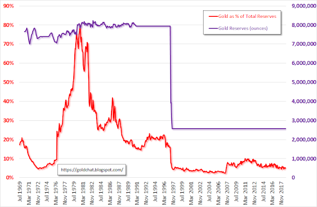 In the video, Martin used the treasury 10 year rate as a comparison but even if cash and gold rates were comparable, this was unlikely to be a fair comparison as the gold market tends to concentrate lending in the shorter end. The chart above from the RBA shows this and if you look at Comex gold futures open interest or LME forwards (which only go out to 5 years), you will see that the liquidity is focused on the short end (note: future and forward prices are related to leasing rates). Compared to maturity transformation in dollar banking, where banks lend for durations beyond 20 years (eg your conventional home mortgage), this concentration on the short end is very significant when trying to assess the risks fractional reserve bullion banking poses to the gold market. The lower the maturity transformation the less a bullion bank is likely to get caught in a run on unallocated gold (although this assumes that bullion banks source a lot of funding via unallocated balances, which is not something there is data on). The RBA also provides historical statistics on its balance sheet, which enable us to look back to 1969 to see how much of the bank's reserves were in the form of gold (note the changing balance of gold reserves pre 1992 may be more a factor of my estimated exchange and gold prices when trying to convert the RBA's AUD balances into ounces).