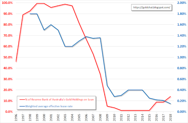 The Reserve Bank of Australia (RBA) recently came under criticism in The Mystery Of The Missing Australian Gold regarding its gold leasing activities (see my initial response to John and Martin). Drilling into the RBA's annual reports I came across some curious relationships between Australia's gold reserves and its money supply. Before I get to that, there is some additional detail I missed in respect of the RBA's gold management and John and Martin's comment that the 0.15% earned on our gold was non-commercial. To recap, the chart below shows the historical gold lease rates (blue line) the RBA has achieved.