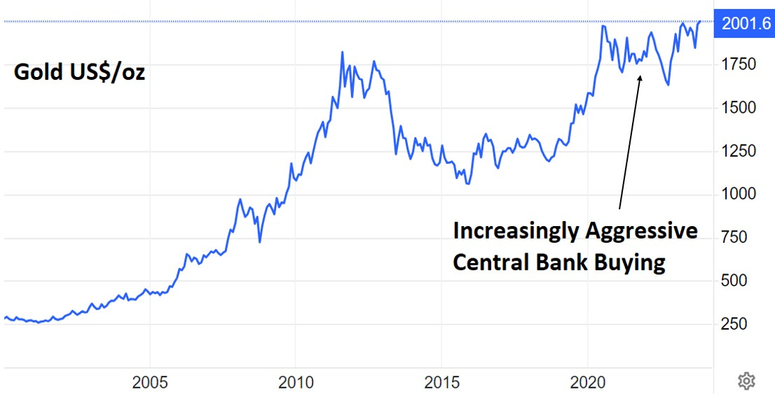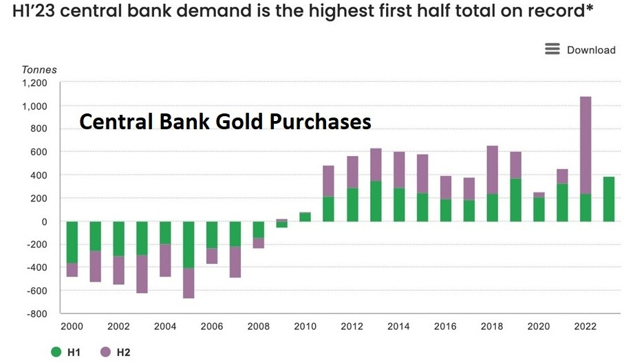 The following chart shows that central banks were net sellers of gold prior to the Great Recession. But when the Fed, ECB, BoJ, and BoE met the housing crash with massive QE while using the dollar as a weapon against any country that threatened the Empire’s interests, other central banks started buying gold for protection. And lately, that buying has become a frenzy. The most recent data (not shown here) has 2023 coming in on par with 2022. 1,000 tons of gold in a single year is massive accumulation.