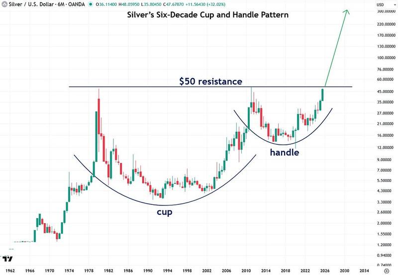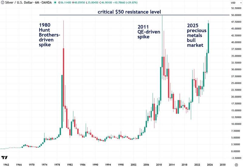 Now, with silver trading around $47 to $48 at the time of writing, it is extremely close to breaking through the key $50 level, which is a major make-or-break point.
