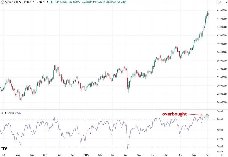 Now I want to say that I adamantly believe silver is going to surpass $50 and go much higher from there in the near future. However, there is something I want to point out. Because silver has surged so strongly and so quickly, it is a bit extended in the short term, which makes it likely that it will consolidate or pause before eventually breaking through $50.