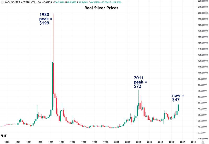 In real terms, the price of silver remains much lower than those previous peaks. That means $50 in 1980 or 2011 is certainly not the same as $50 in 2025, as anyone who has recently been to the grocery store can easily understand.