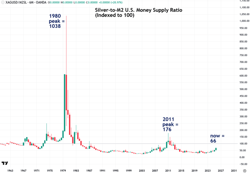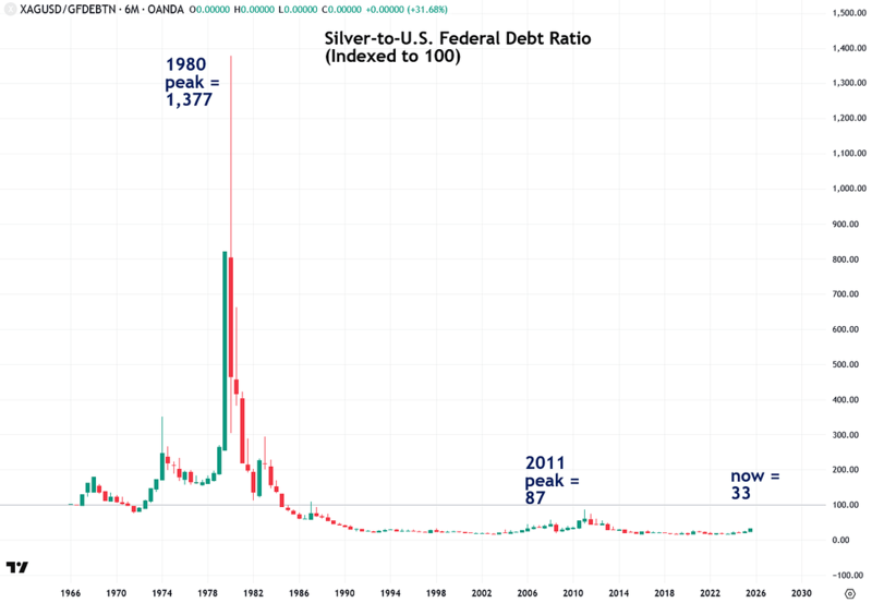 The chart, indexed to 100, shows that this ratio was 1,377 at the 1980 peak, 87 at the 2011 peak, and only 33 today. This indicates that silver has substantial room to catch up to the expanding national debt. In that context, $50 silver is not expensive by any measure, and a move to $100 or more is far from inconceivable.