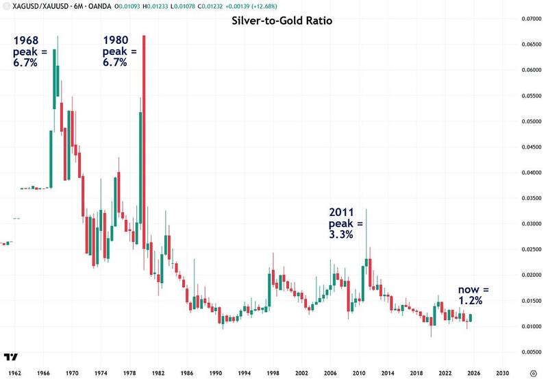 While gold has always been more expensive than silver throughout history, the gap between them has varied significantly. At the 1980 peak, silver was 6.7% of the price of gold. At the 2011 peak, it was 3.3%. But now, silver is just 1.2% of gold’s price, which is far below historical levels.