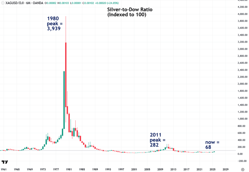 Another useful way to determine whether silver is cheap or expensive compared to its past is to measure it against another yardstick: the Dow Jones Industrial Average.