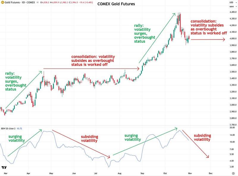 After a surge in volatility during the gold rally in September and early October, as measured by the Bollinger Band Width indicator beneath the price chart, volatility is now subsiding in gold and across the broader precious metals complex. This indicates that precious metals are likely forming a new consolidation phase as they build energy for the next major move.