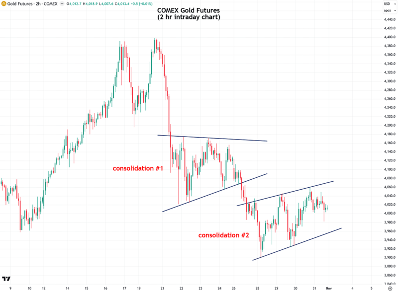 Gold is officially oversold within an uptrend, which is typically a bullish signal, but there’s one more development I want to see play out first. A consolidation pattern is currently forming on the 2-hour intraday chart, labeled “Consolidation #2” on the chart below. On October 26th, I pointed out “Consolidation #1” and noted that it could break in either direction, and it ended up breaking to the downside.