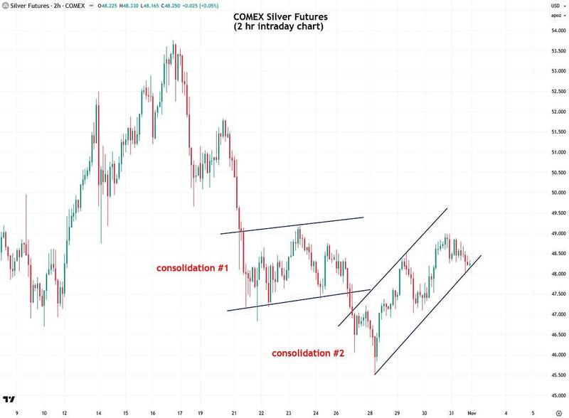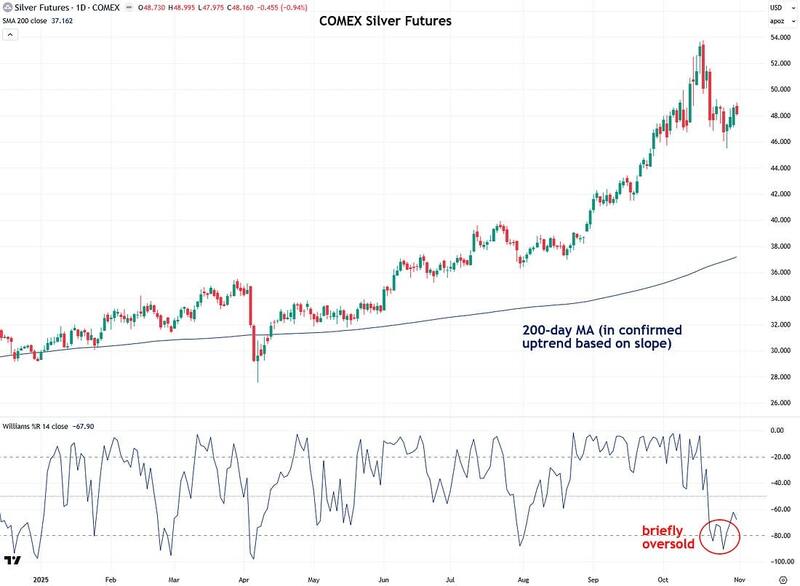 Similar to gold near its key $4,000 level, silver’s price action is occurring just below the key $50 level, which isn’t surprising since there are usually a lot of algo games played around major levels that so many eyes are watching.