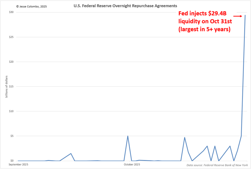 Also, I want to point out something very relevant to the discussion of whether the precious metals pullback is over, and that is a highly unusual and alarming occurrence on Friday, when overnight repo demand spiked to $29.4 billion, the highest daily level in more than five years. Repos are short-term loans the Fed extends to banks when they need immediate liquidity.