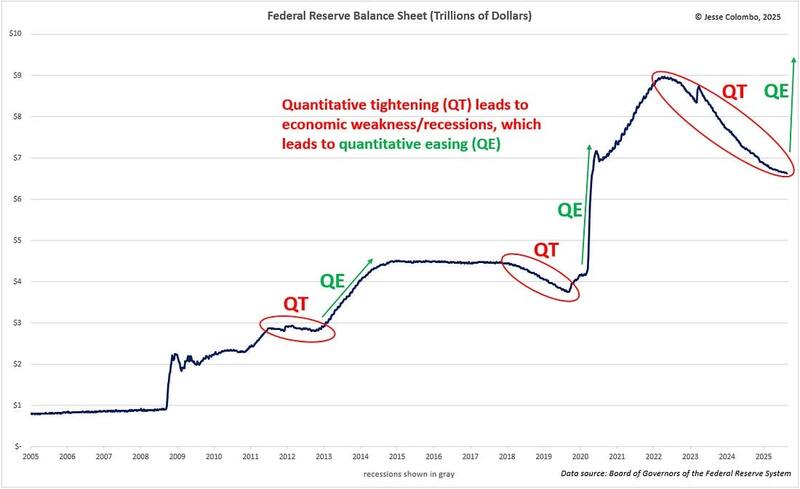 The Fed’s quantitative tightening (QT), or shrinking of its balance sheet, since 2022 has set the stage for the growing financial stress now emerging, which is reminiscent of what occurred in late 2019 and ultimately led to massive QE that was officially attributed to the COVID pandemic.