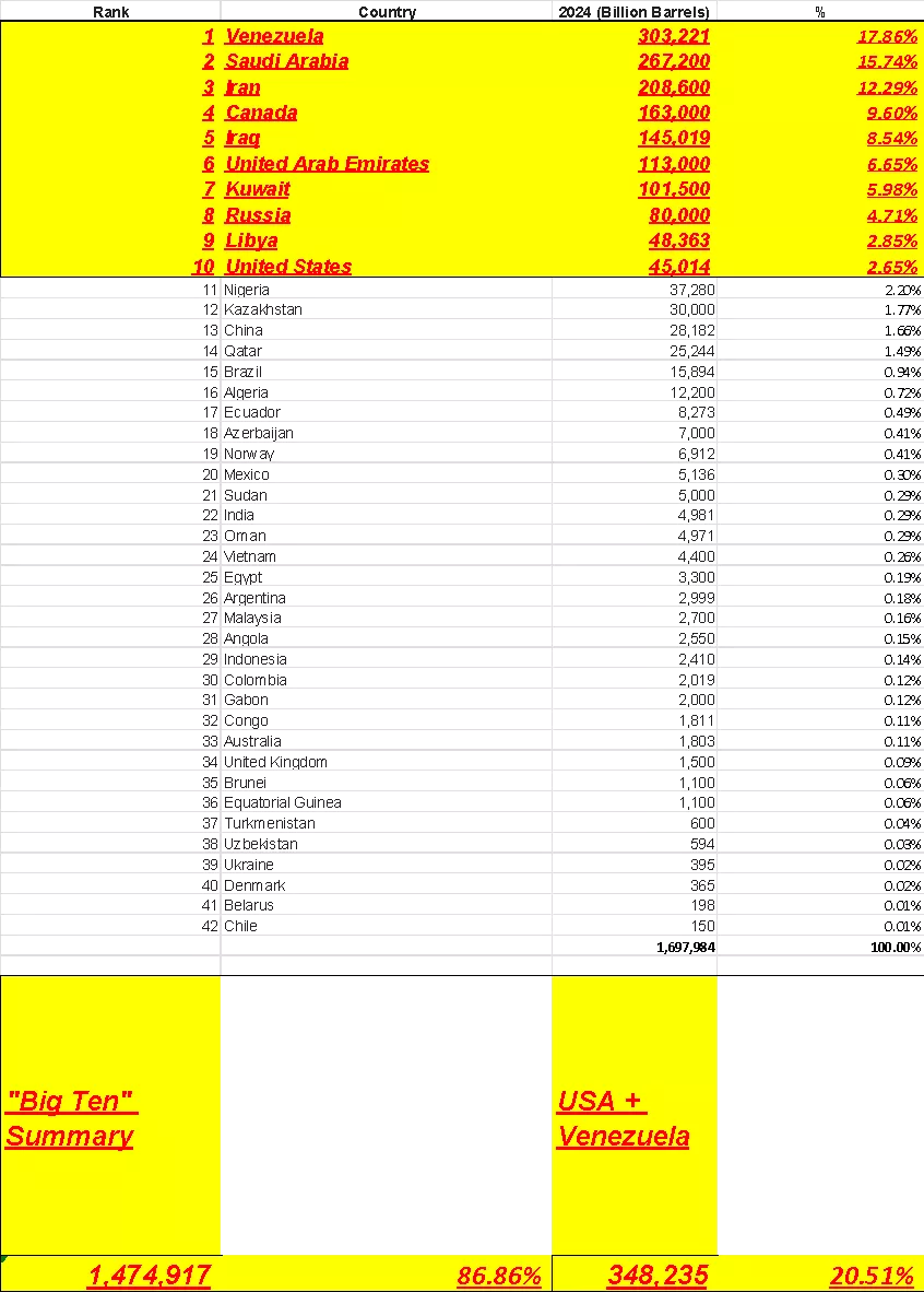 The background context from here is all my opinion but I’m backing it up with facts about who has the oil reserves. So I cooked up this spreadsheet that shows where all the reserves are worldwide and I’ve highlighted the top ten. Number one is Venezuela and number 10 is the USA.Together these ten nations have nearly 90% of the world’s oil reserves.And about a quarter of that 85%-90% is now under Trump’s control.