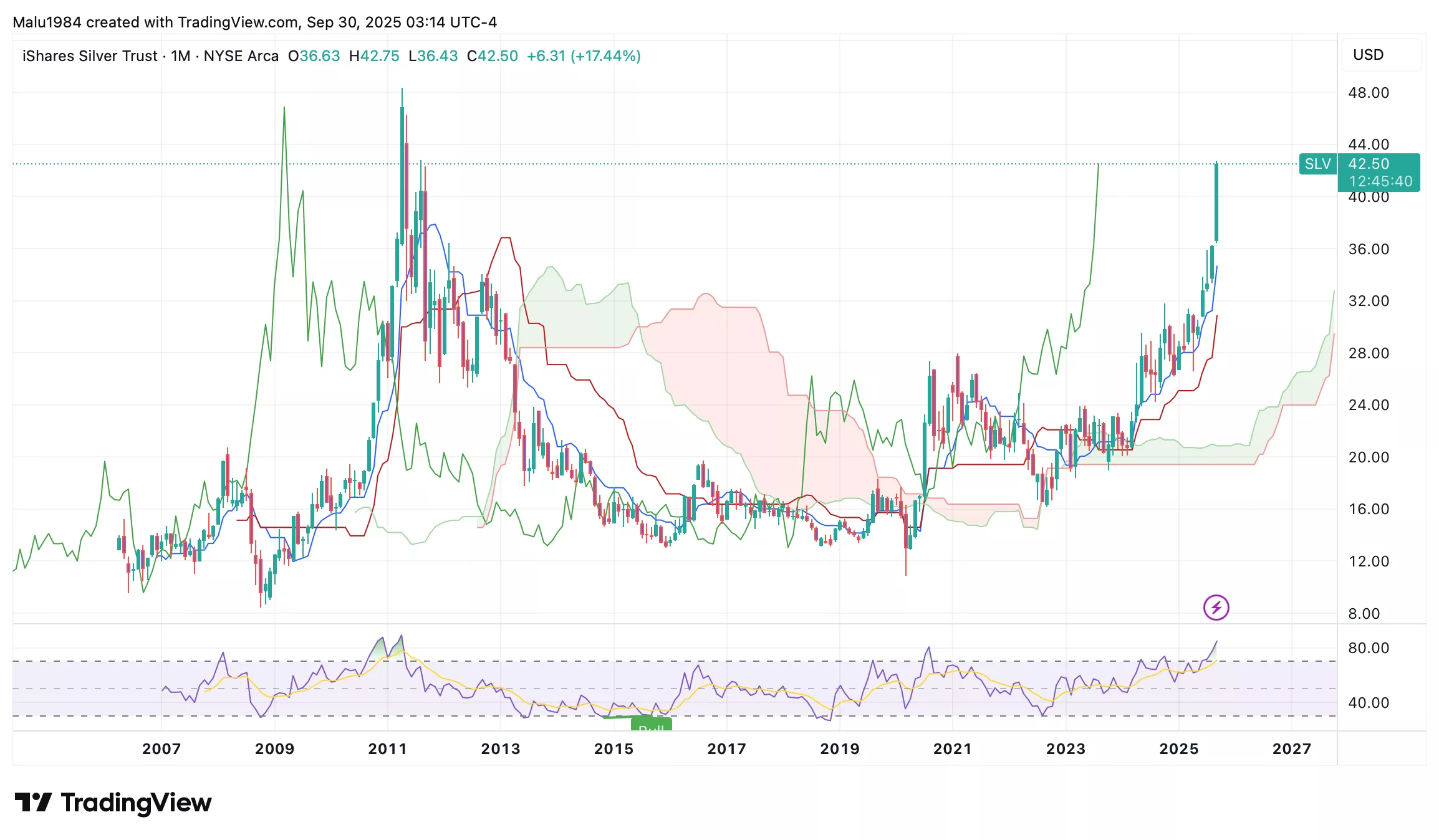 Overall outlook: The technical picture for SLV is very bullish, with strong momentum across both charts. However, RSI shows the price is overbought, and distance from the cloud makes a short-term correction possible before the larger trend continues.