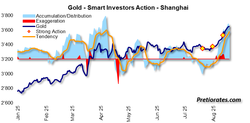 However, smart investors have been buying Gold heavily again in recent days and weeks. The accumulation, shown in the chart by the light blue area, has increased significantly in Shanghai,