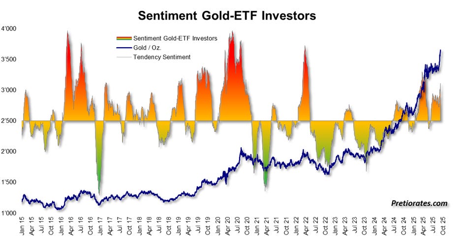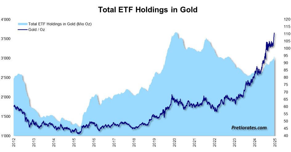 And what about the annual production of around 3,300 tons of Gold, the relationship between supply and demand? Its influence is marginal. Several thousand tons change hands every day in London, and even more on the COMEX via futures. More importantly, Gold is not consumed, it does not disappear. Global reserves – now standing at 216,265 tons – are simply growing by around 1.5% per year. A drop in the ocean. The higher the price of Gold rises, the stronger the urge to take profits becomes. For the price of Gold to continue to rise, demand must therefore increase. The same applies to the downward trend.
