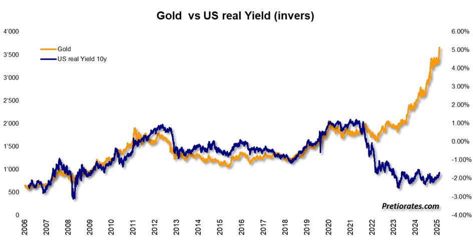 Since spring 2022, however, real market returns have ceased to set the pace. The trigger? Hardly coincidentally, it was the war in Ukraine, which began in 2014 with the Maidan, but only came to the attention of the world public with the Russian invasion in 2022. Since then, the price of Gold has moved largely independently of real returns. The decisive driver remains confidence in one's own government.