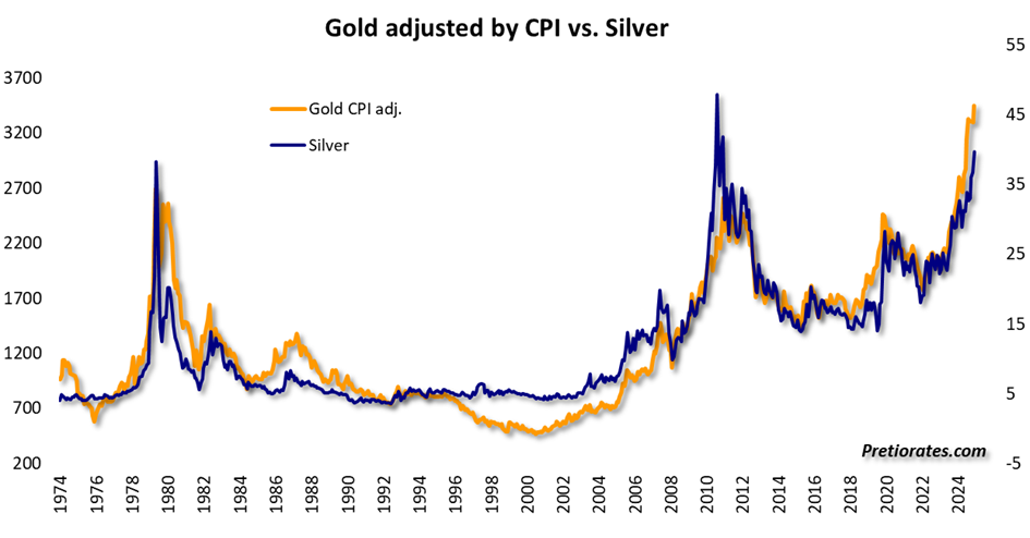 At the same time, Silver remains the eternal laggard – with plenty of catch-up potential. In purely mathematical terms, based on the inflation-adjusted price and compared to the price of Gold, the price of Silver should have reached around US$45 per ounce long ago.