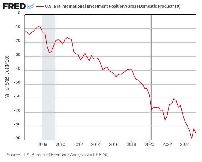 The net international investment position for the US was negative $26.14 trillion at the end of the second quarter (assets of $39.56 vs. liabilities of $65.71). That’s about 85% of US GDP, as the chart above shows. They (the rest of the world) own more of us than we own of them. And yes, there is a bright side to this. What is it?