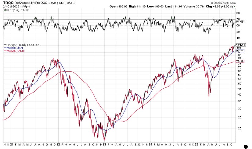 That’s why I included the first chart above. It’s the ProShares UltraPro QQQ [TQQQ] exchange-traded fund (ETF). It has $24.5 billion in assets under management. That makes it the largest single leveraged ETF trading on the market (currently trading at an all-time high). But by no means is it the ONLY leveraged ETF.