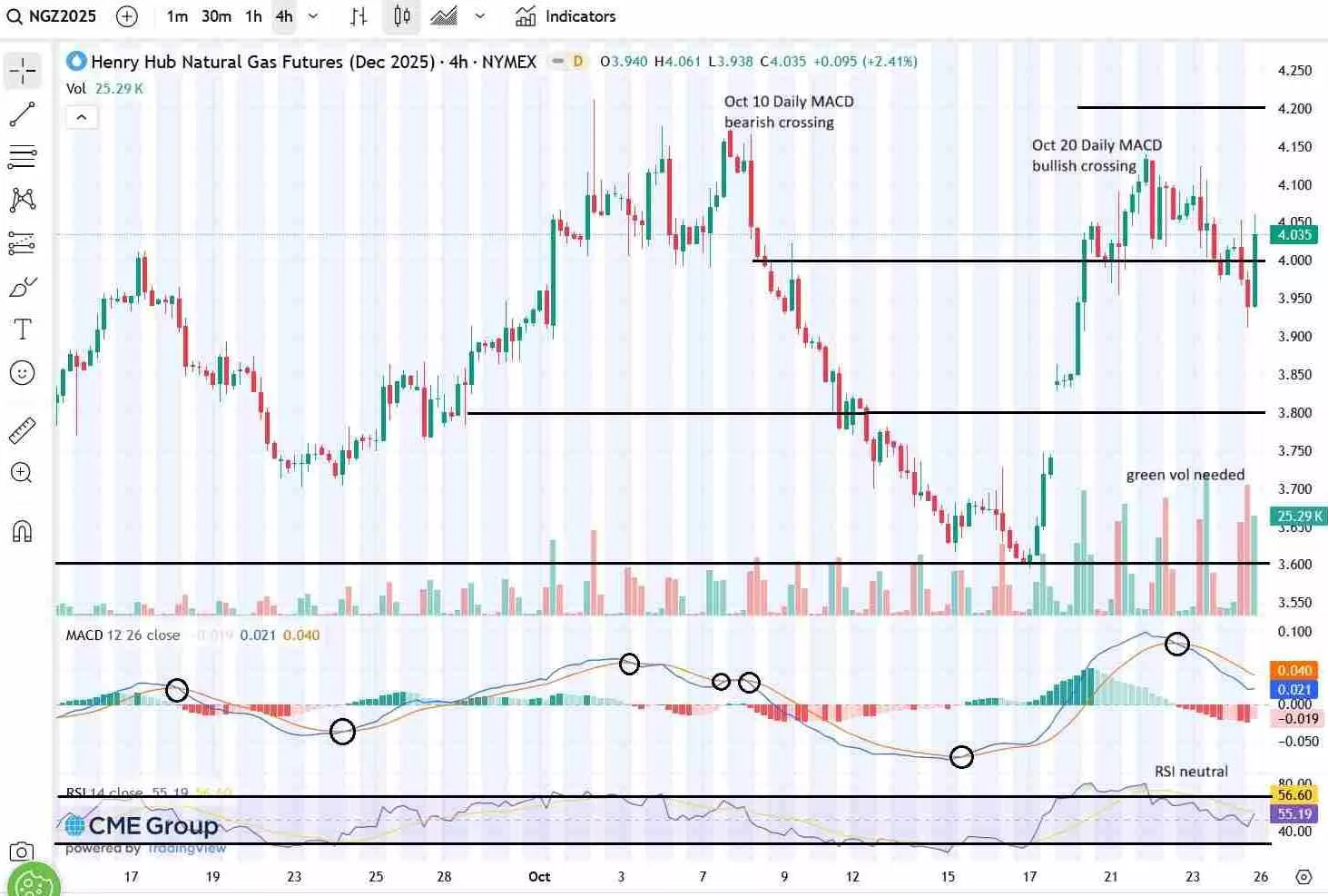 We have been buying these latest dips again and again, as the market is still showing some range-bound behavior. We want to operate on the 4H charts, buying any momentum from a cheaper price level coming our way on this winter uptrend. The market cannot properly breakout however since last summer so we remain vigilant in identifying this coming seasonal ceiling. The first sessions of the December contract trading in larger volumes are very important as the refill season is going to be prolonged for a few weeks hitting a record 8-month build. Is $4.00 our new $3.00? For this uptrend to continue, new support levels have to be formed at $4.20 and then $4.40, but we might not have that much time ahead of this winter. Any higher pricing could only be in the form of a few spikes until mid-February. So trading the near-term charts is really important to us. At this point, a shorter use of the market from across the board on hedging activity for end-of-year trading does not look too important. This might change in the coming month.