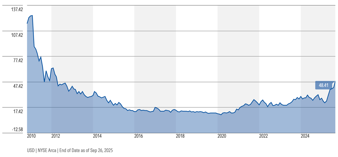 Uranium ETFs are seeing record inflows, with the industry flagship Global X Uranium ETF (NYSE Arca: URA) volume increasing by nearly 30% last month, vs. the prior 3-month average. The ETF has appreciated from $20.51 per share in April to around $48 today, but remains well below its 2011 highs. Leading domestic and allied uranium mining company shares have seen triple-digit returns over the past year.