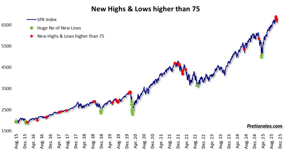 The next chart also provides useful information – not perfect, but valuable in the context of other indicators: when a large number of stocks reach new annual highs, but at the same time just as many stocks reach new annual lows, the overall market appears less convincing. The opposite – the green dots – often indicates hidden strength during periods of weakness. Recently, however, we have seen significantly more red dots.