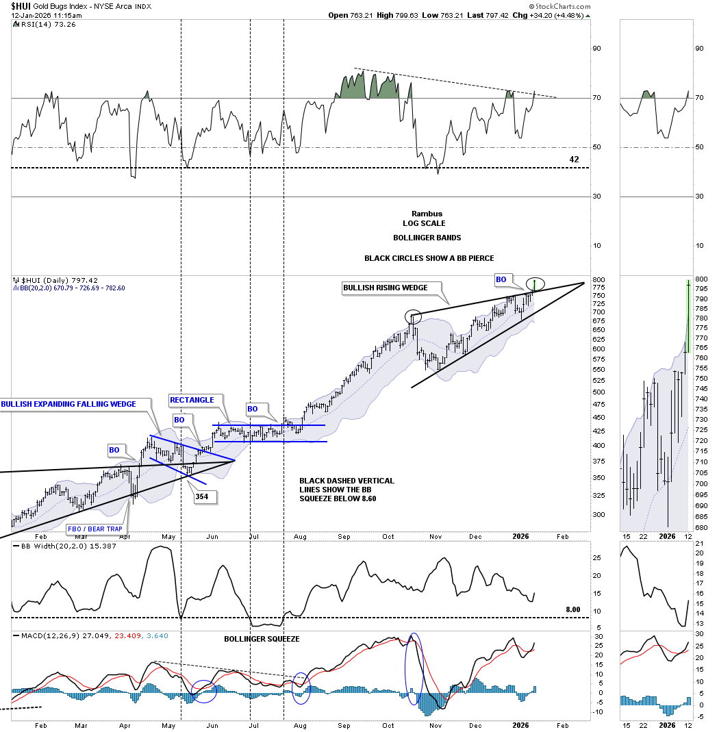 There is one small caveat for the very short term. Today the price action is trading above the top BB band which it can do for 1 to 3 days or so but the odds are very high that the price action will decline back into the channel. The price action can ride the upper band for long periods of time but you don’t want to see it pierce the upper band. A backtest to the top trend line of the bullish rising wedge should be expected but no 100% guarantee. Use any weakness to accumulate.