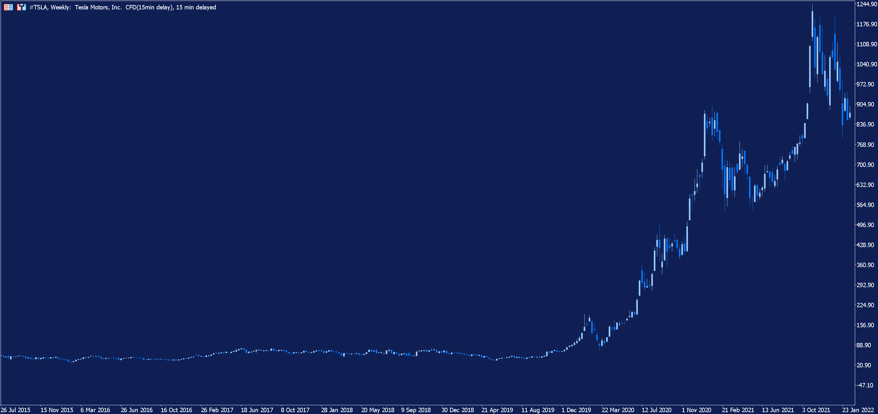Depicted: Admirals MetaTrader 5 – Tesla Weekly Chart. Date Range: 26 July 2015 – 14 February 2022. Date Captured 14 February 2022. Past performance is not a reliable indicator of future results.