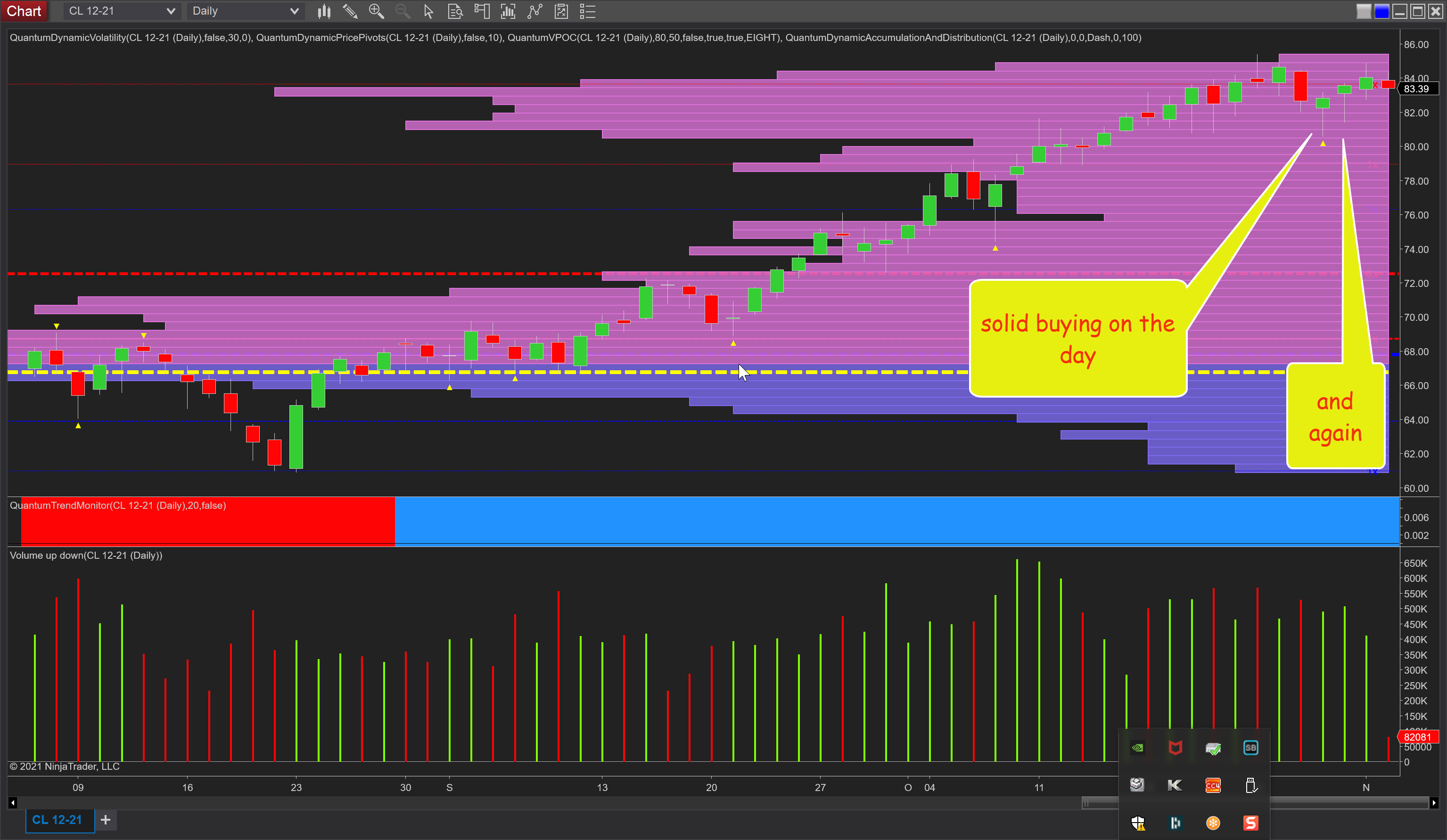 This short-term reversal lower was as expected following the weakness signaled on the 25th of October with the market struggling to move higher on excellent volume and closing with a typical shooting star candle which duly confirmed the sell-off. However, note the two candles of the 28th October and the 29th October. On both days, the price of oil fell, but then recovered to close higher on the day and end with a deep wick to the lower body on excellent volume. And in fact, the price action of the 29th October opened gapped up to add further weight to the bullish momentum with a repeat performance. The first day of the new trading week and of November opened was muted but once again with the commodity heading upward to test the $85 per barrel area, and currently trading at $83.50 per barrel at the time of writing. The $85 per barrel level is the key one moving forward and if this is breached on good volume is likely to provide the springboard for a further leg in the bullish trend.