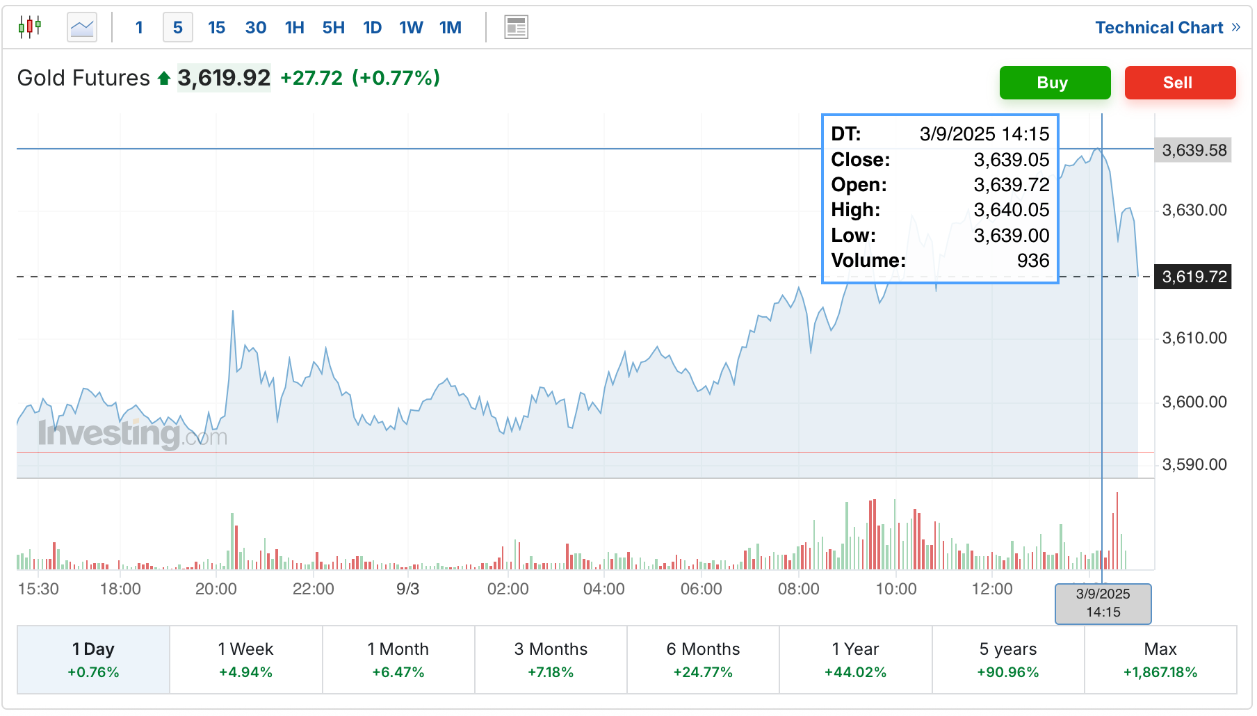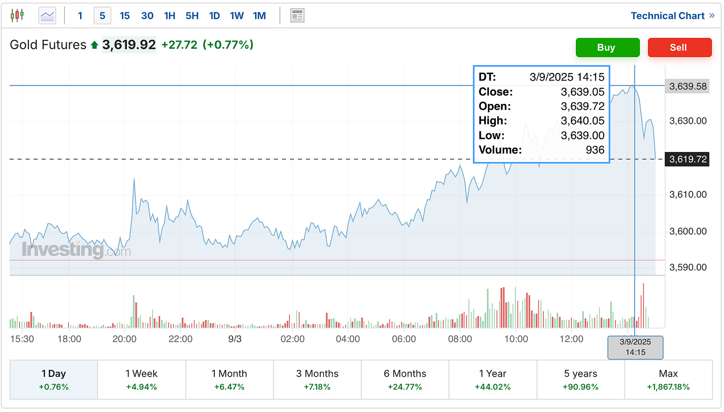 The high point of the day, the year, and of gold futures trading history were all set on Wednesday afternoon at $3,640.