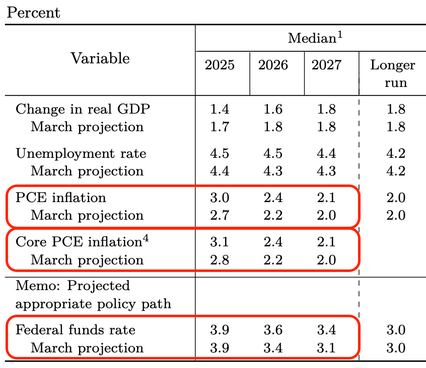 The top line of each category represents the current projections that came out today, and on the second line you can see the projections issued last quarter at the Fed’s March meeting.